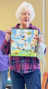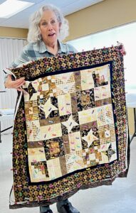 Susan Smith demonstrates next month’s pattern and Jeanie Brooks won this month’s blocks