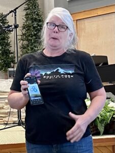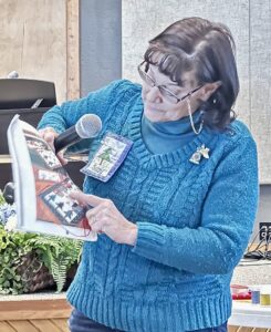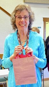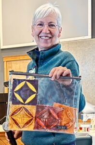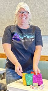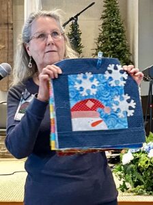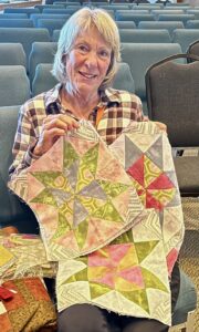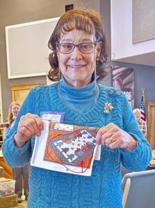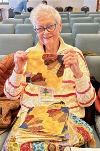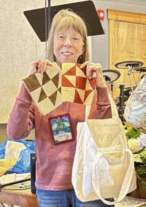 Susan Smith demonstrates next month’s pattern and Jeanie Brooks won this month’s blocks
