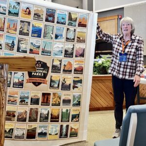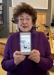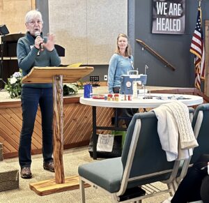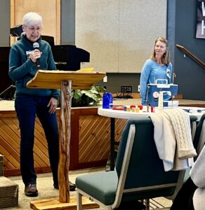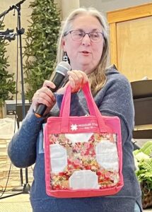 Laura describes the project that will occur after the January meeting – those who stay will make placemats for the community seniors who receive Meals on Wheels