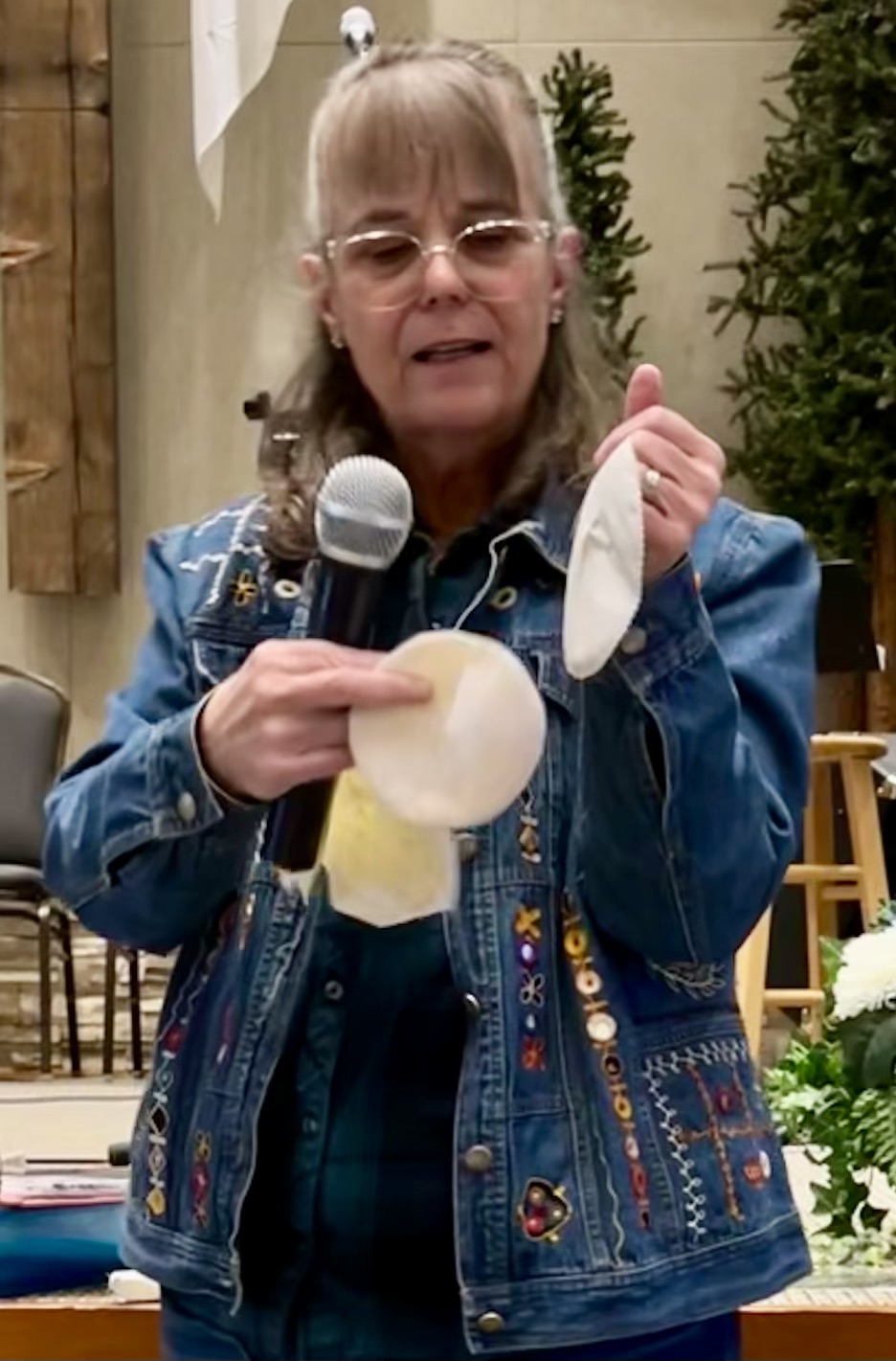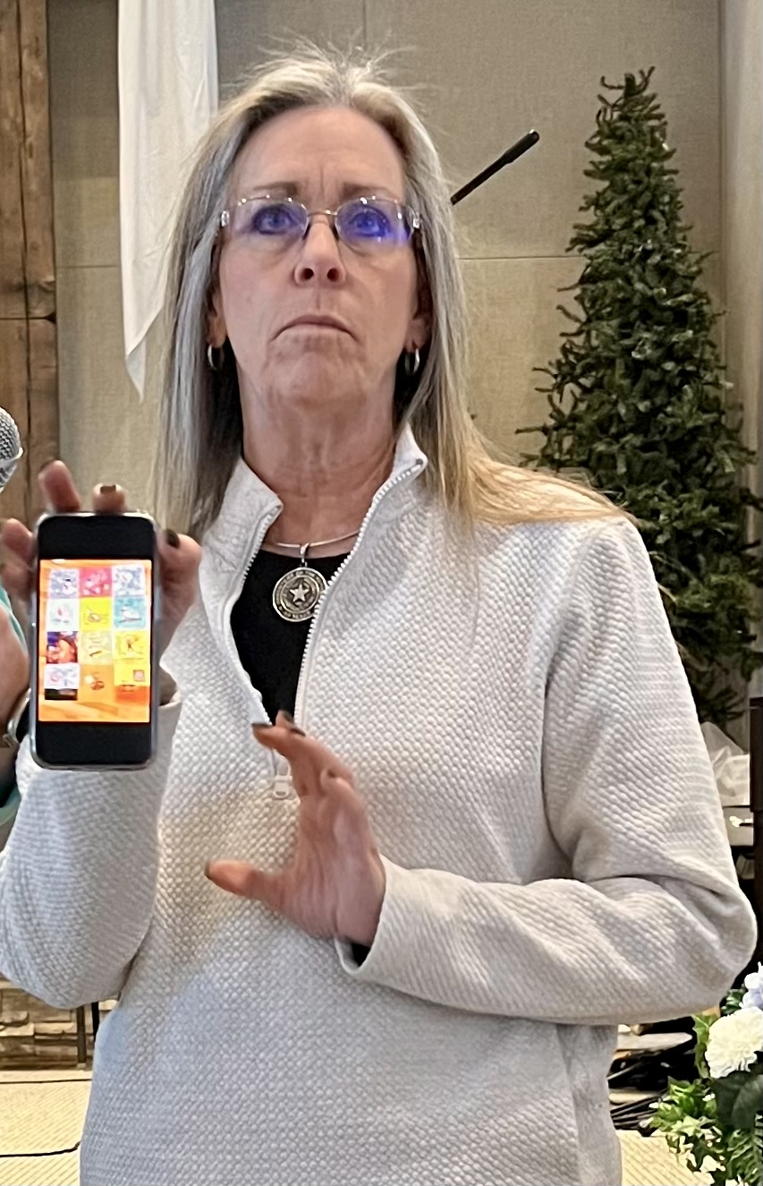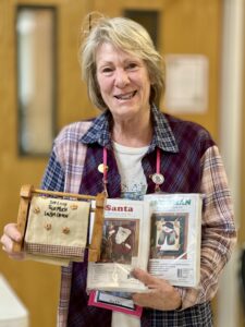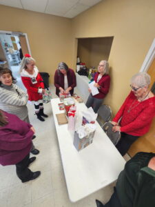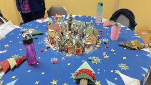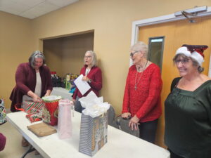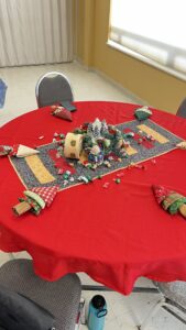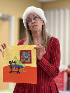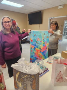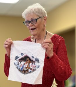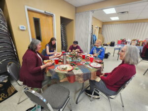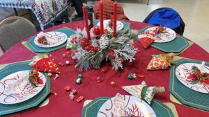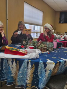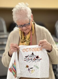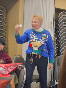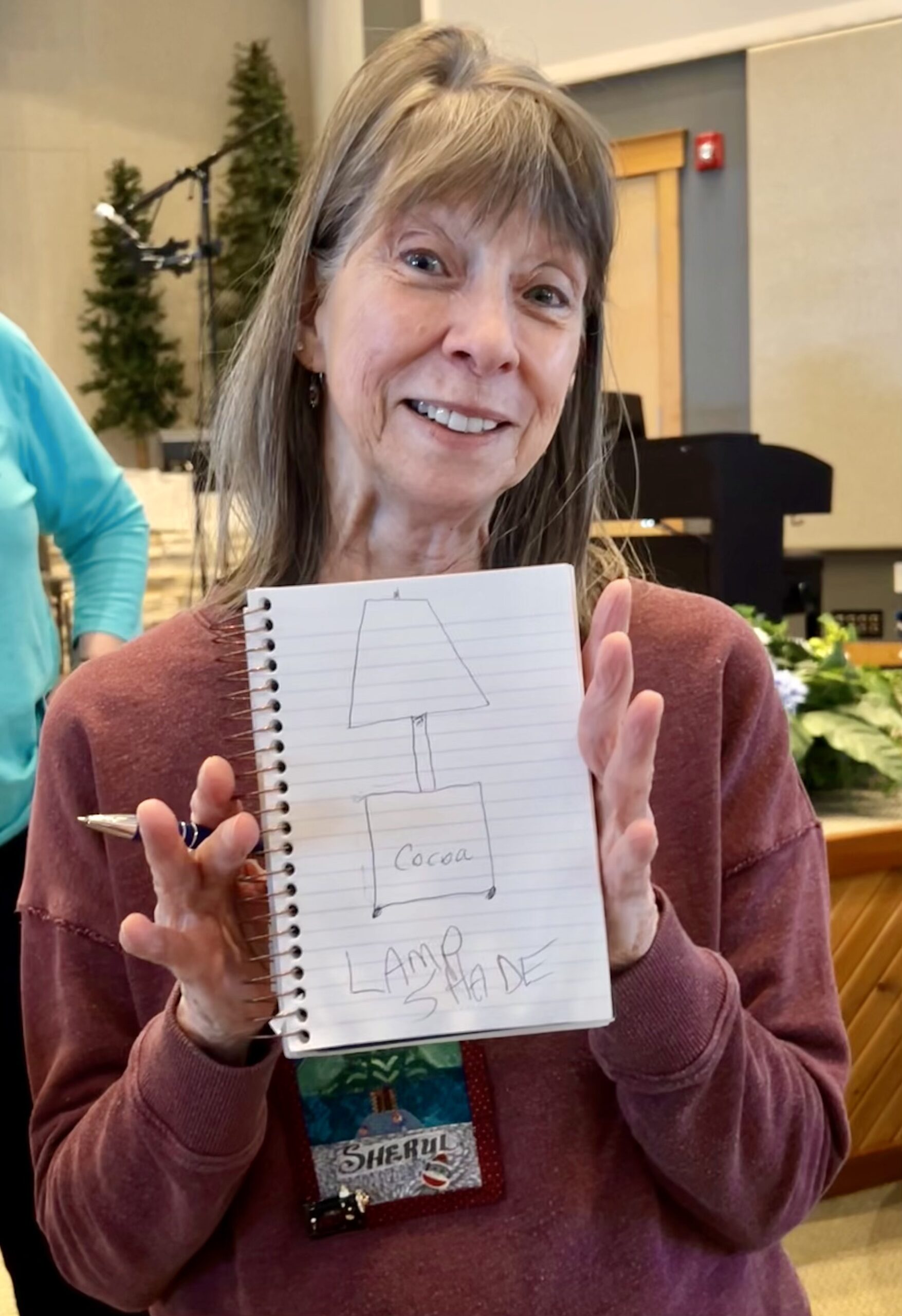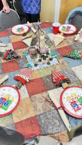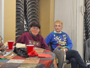 Laura describes the project that will occur after the January meeting – those who stay will make placemats for the community seniors who receive Meals on Wheels