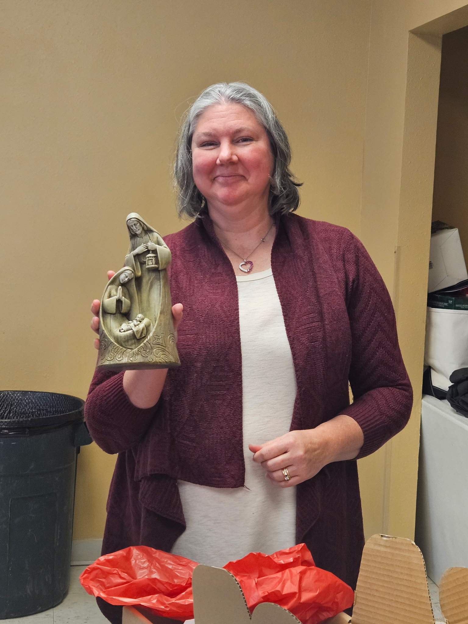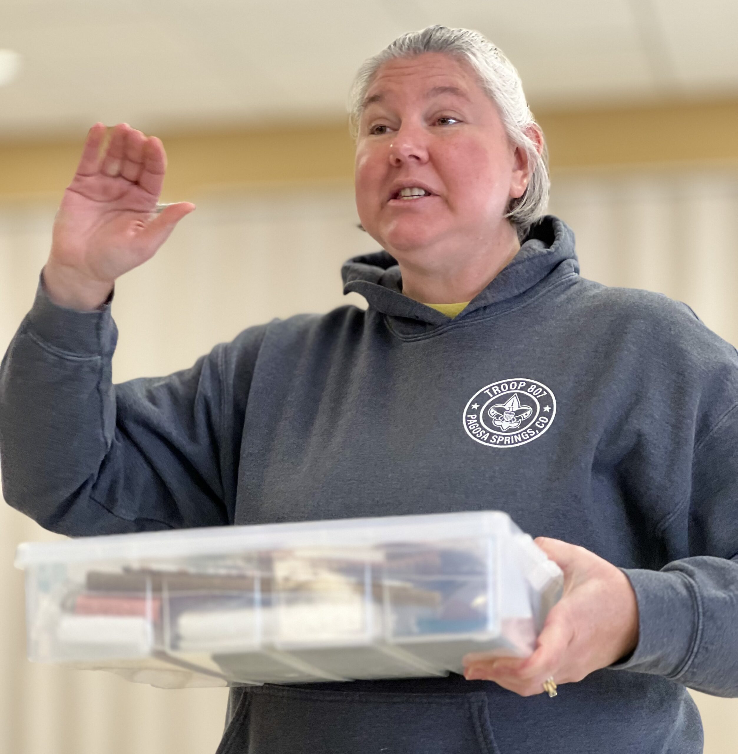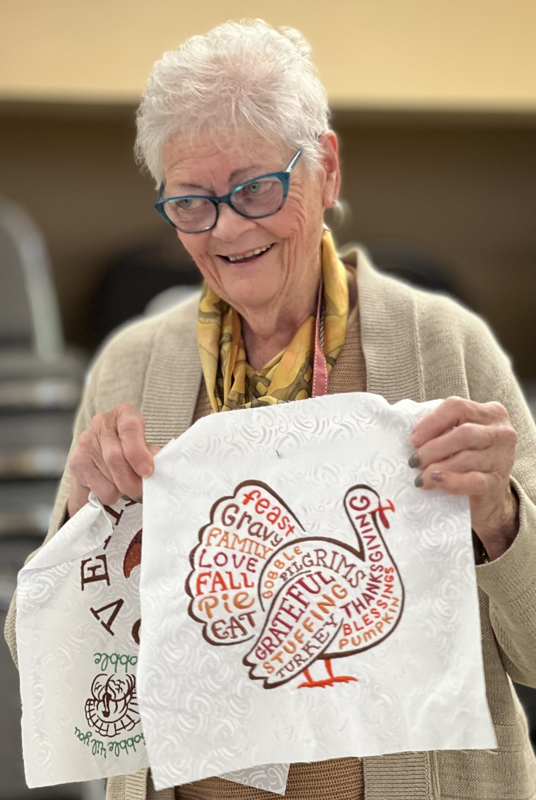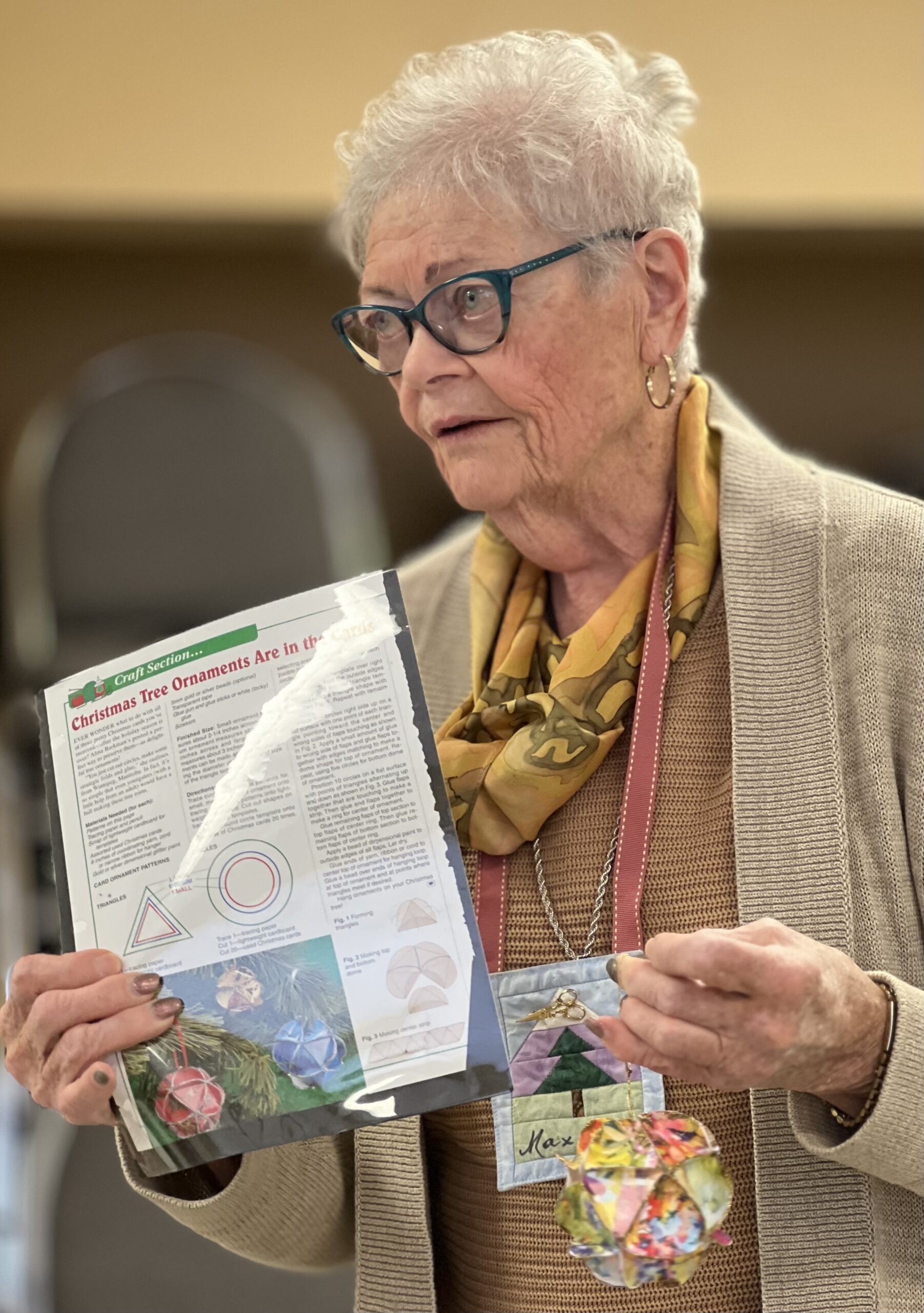Laura describes the project that will occur after the January meeting – those who stay will make placemats for the community seniors who receive Meals on Wheels