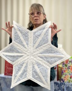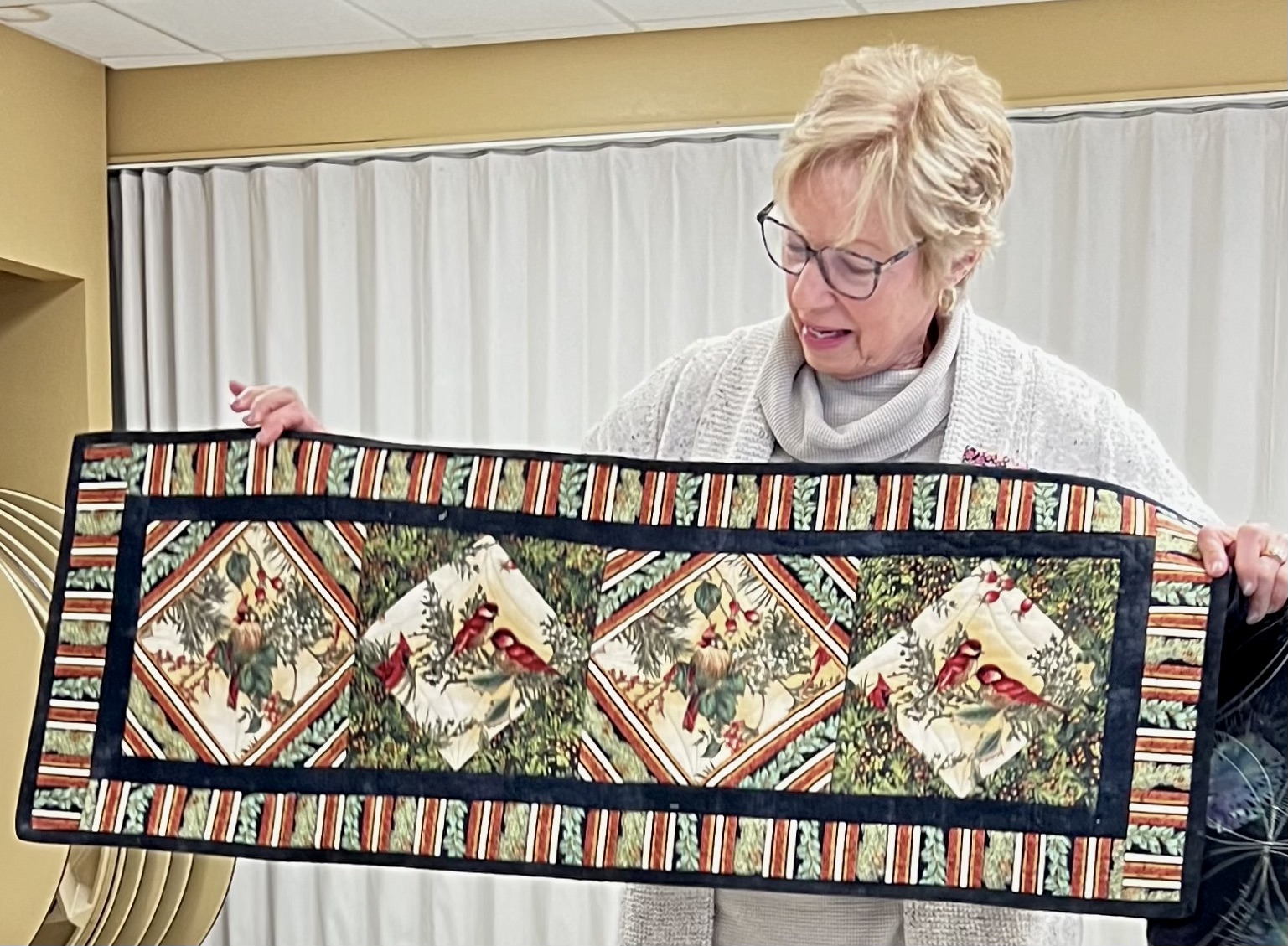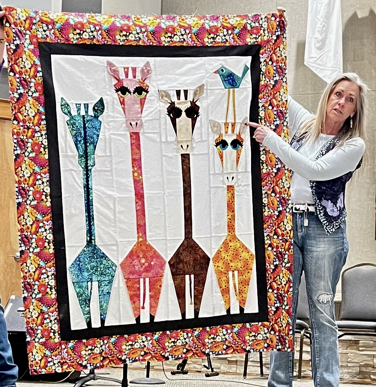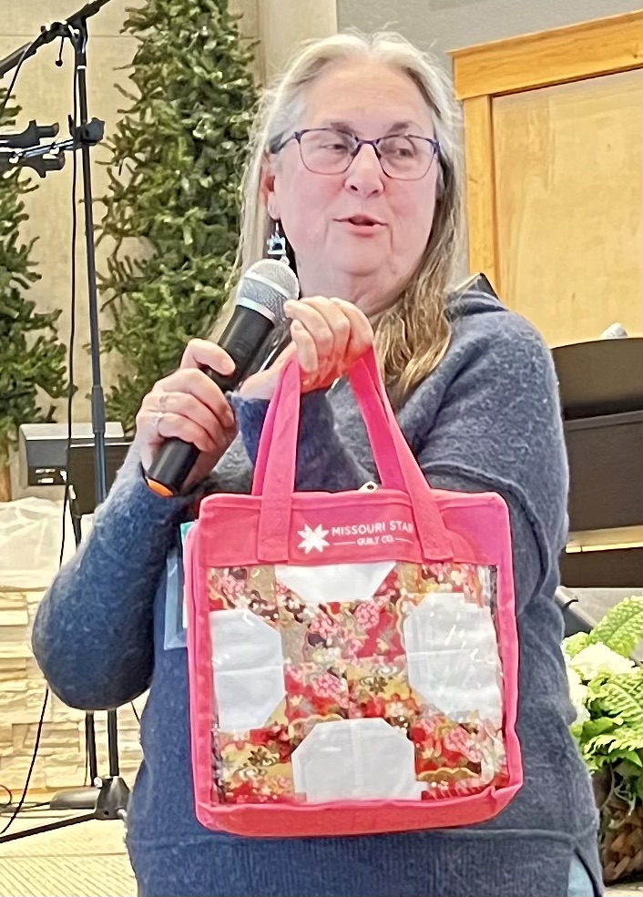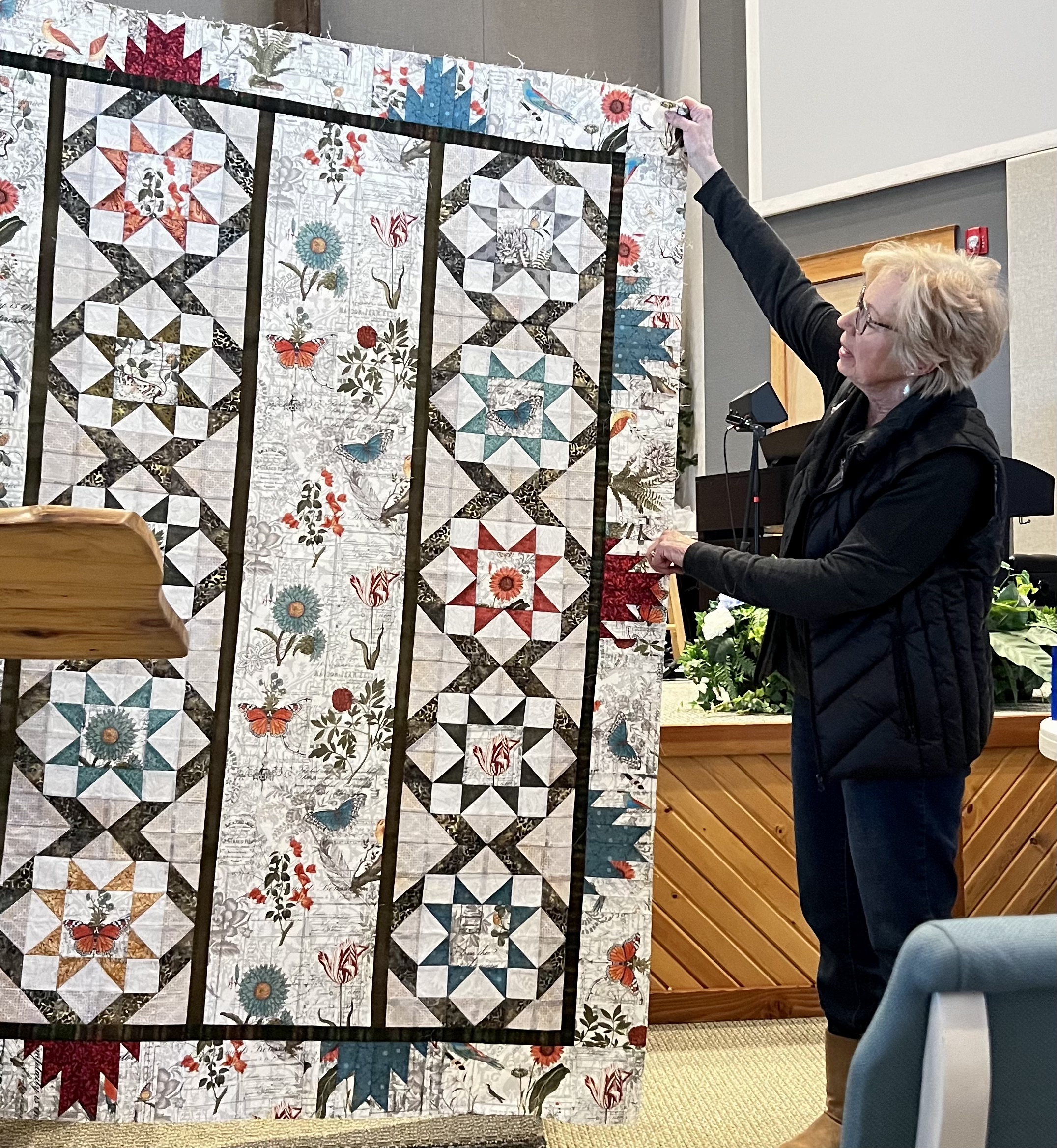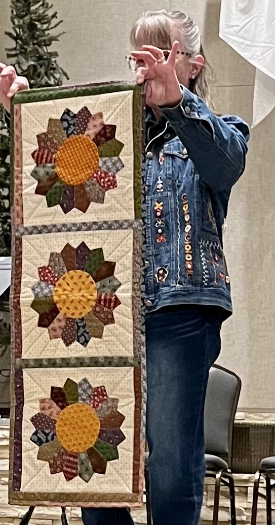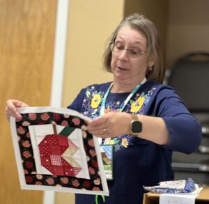 President Carla Hellwege displayed a Bow Tie block, one of the 2025 Challenge Quilt requirements