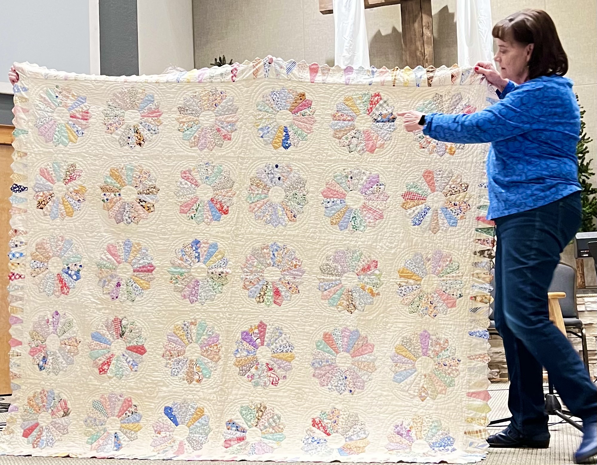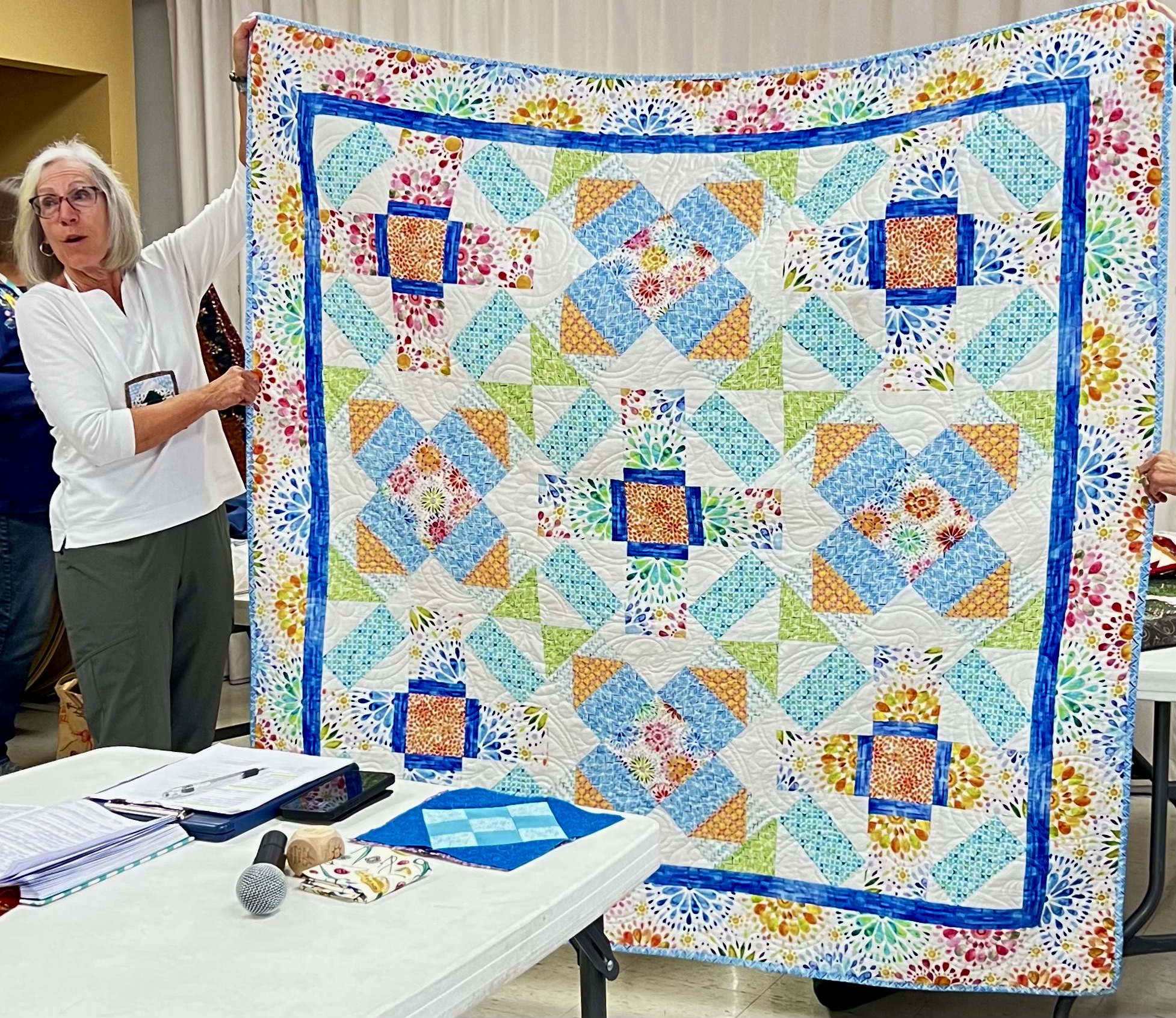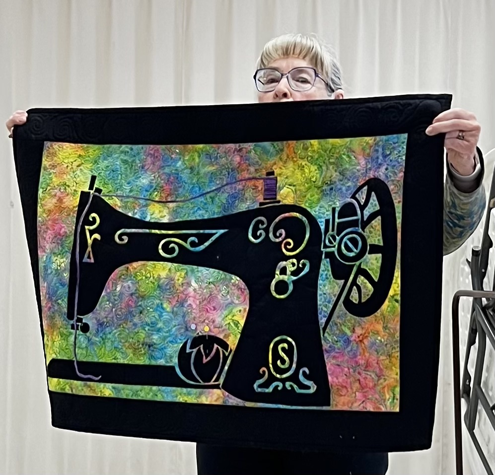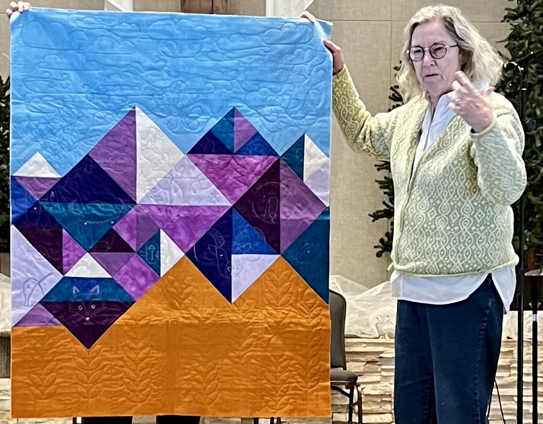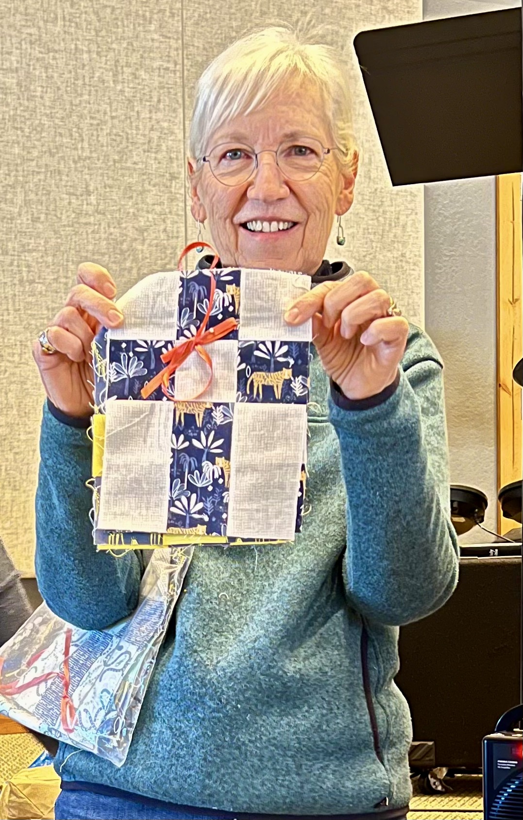 President Carla Hellwege displayed a Bow Tie block, one of the 2025 Challenge Quilt requirements