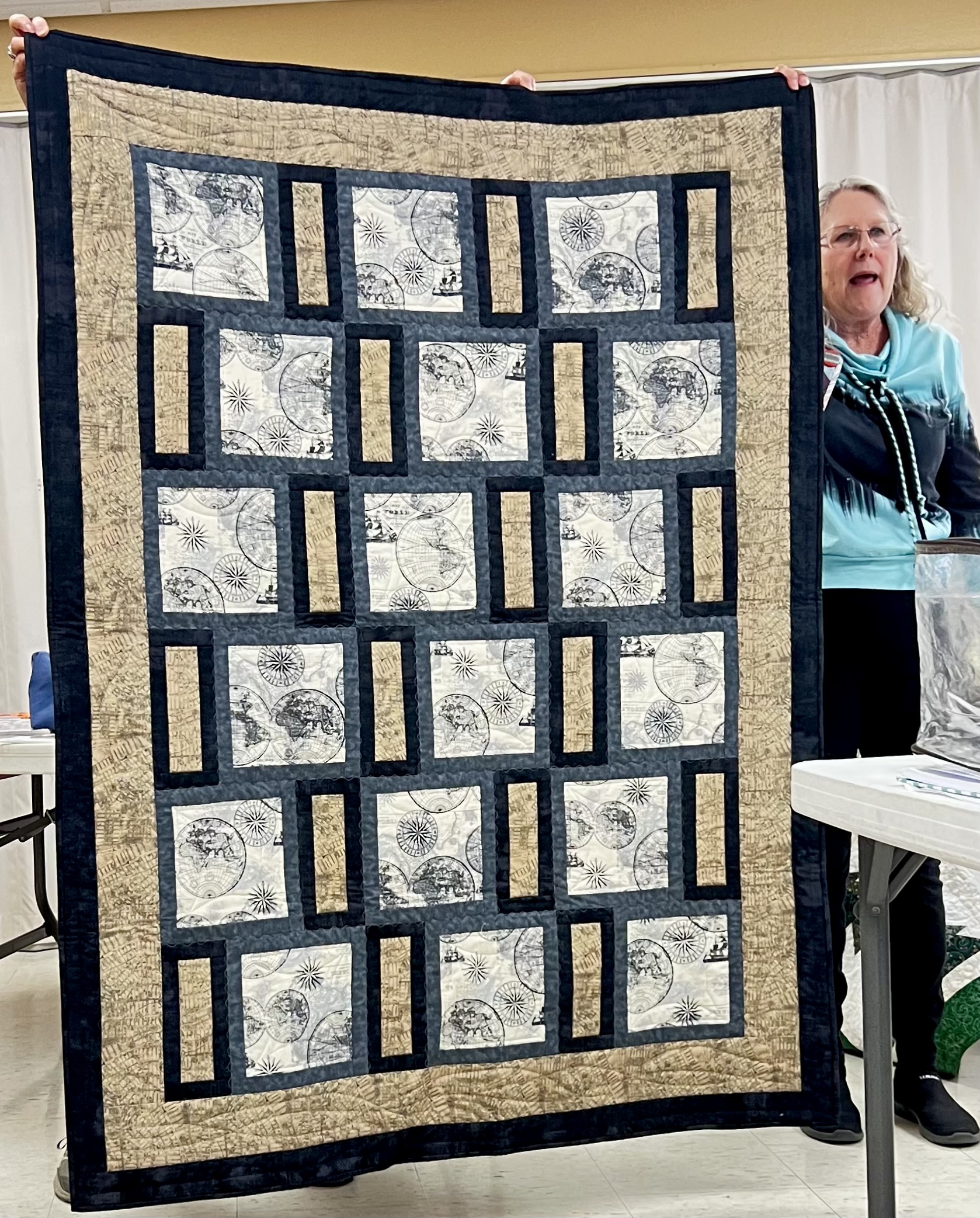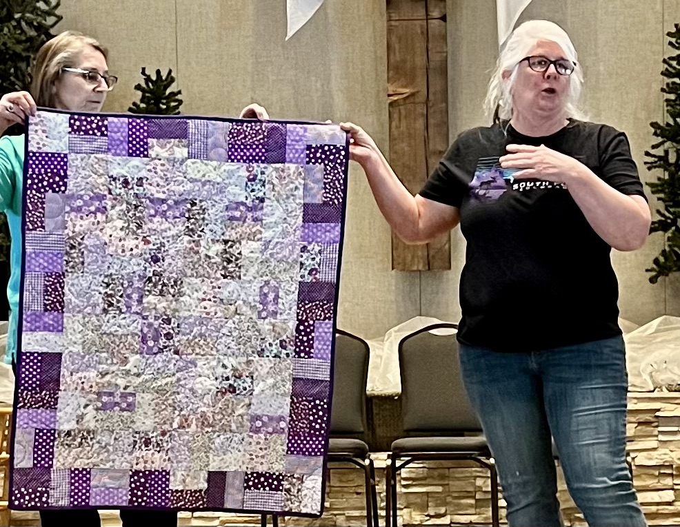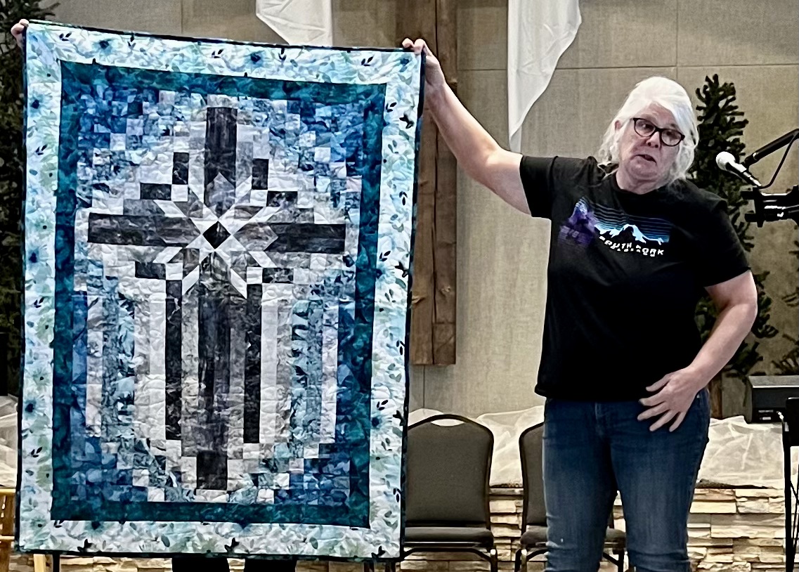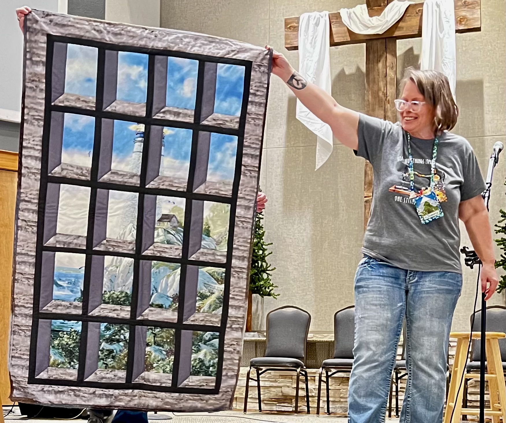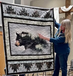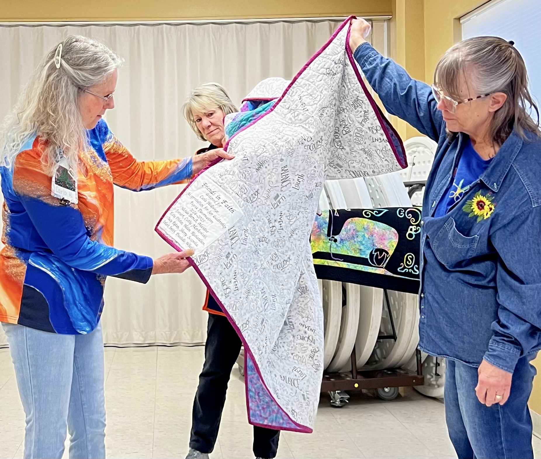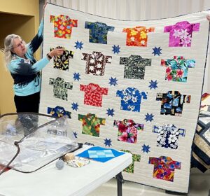 President Carla Hellwege displayed a Bow Tie block, one of the 2025 Challenge Quilt requirements