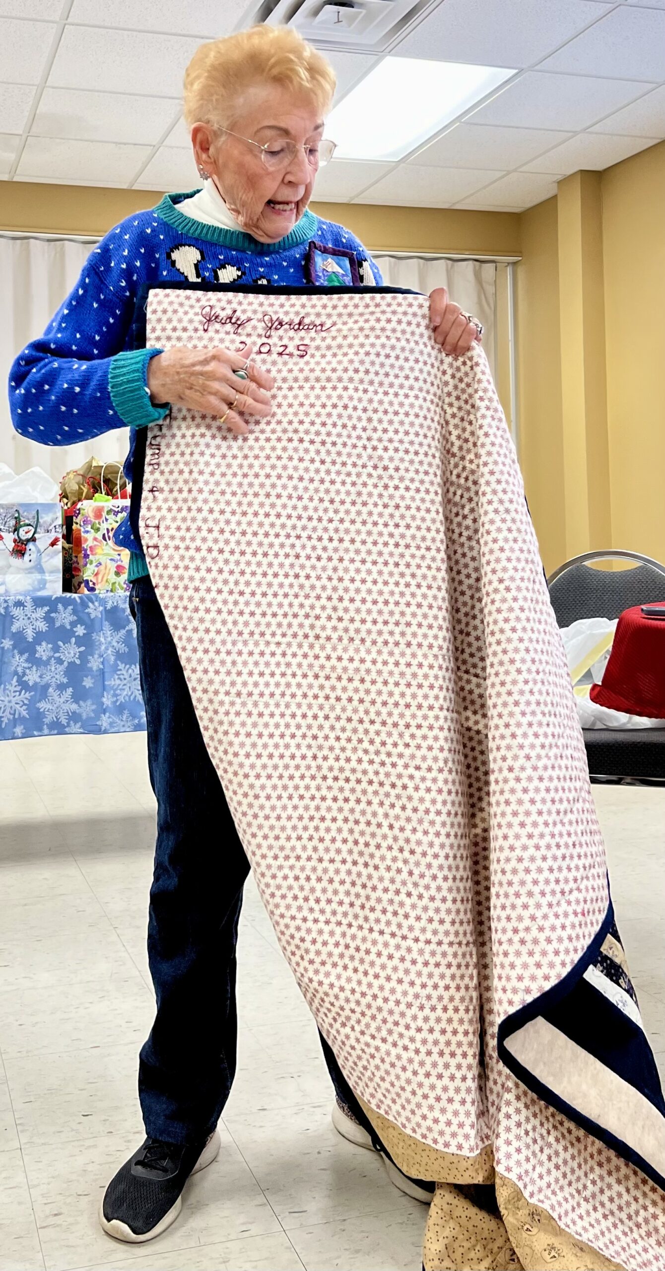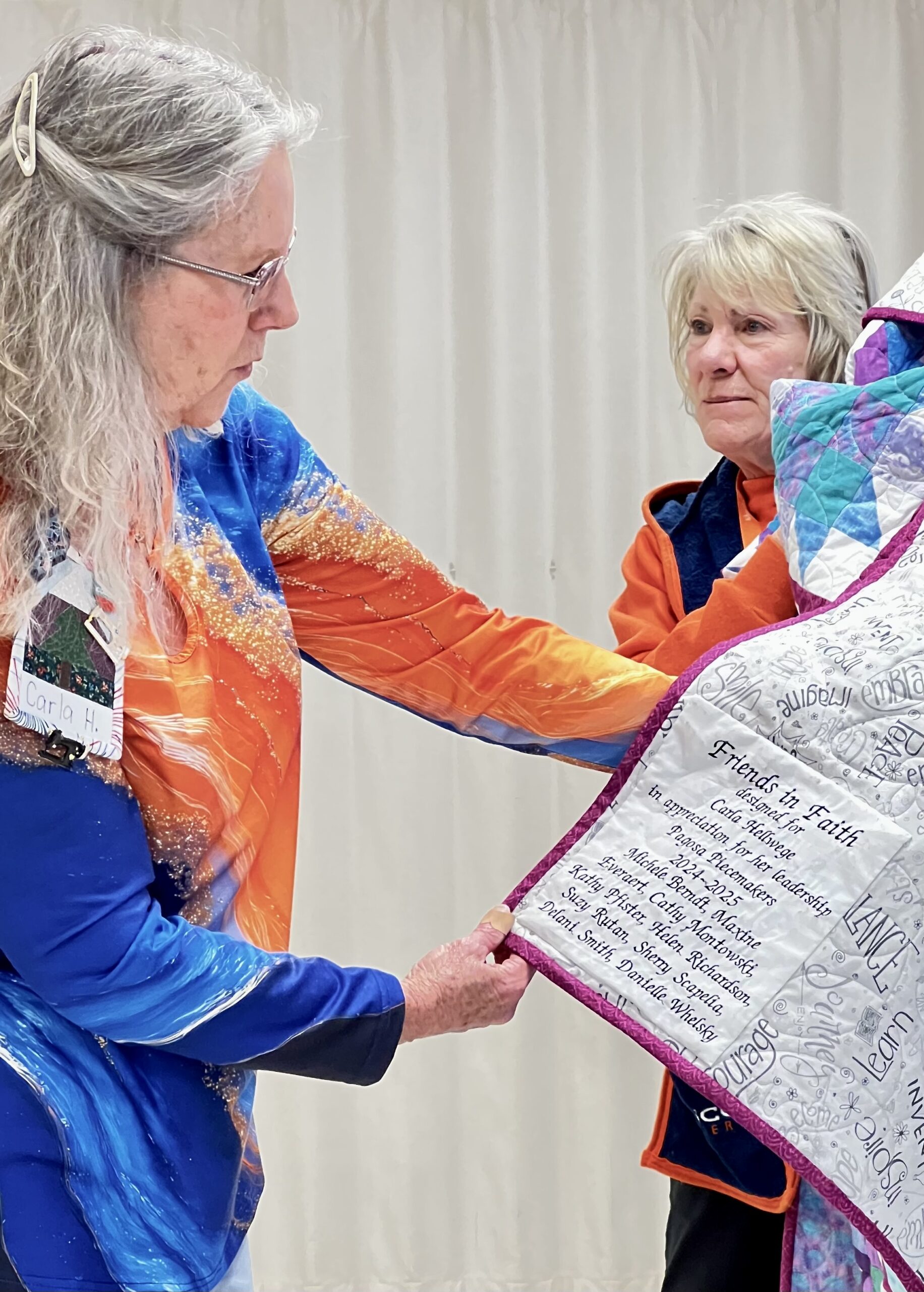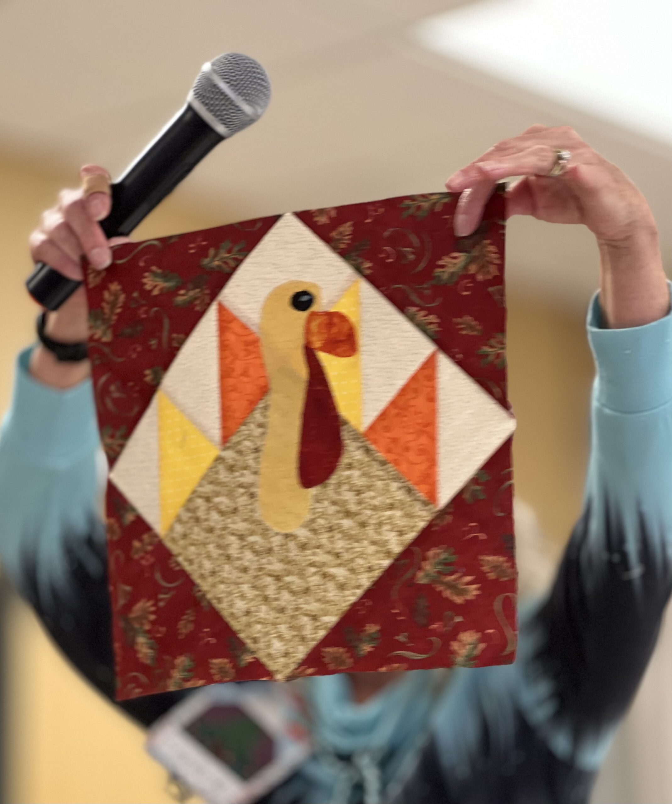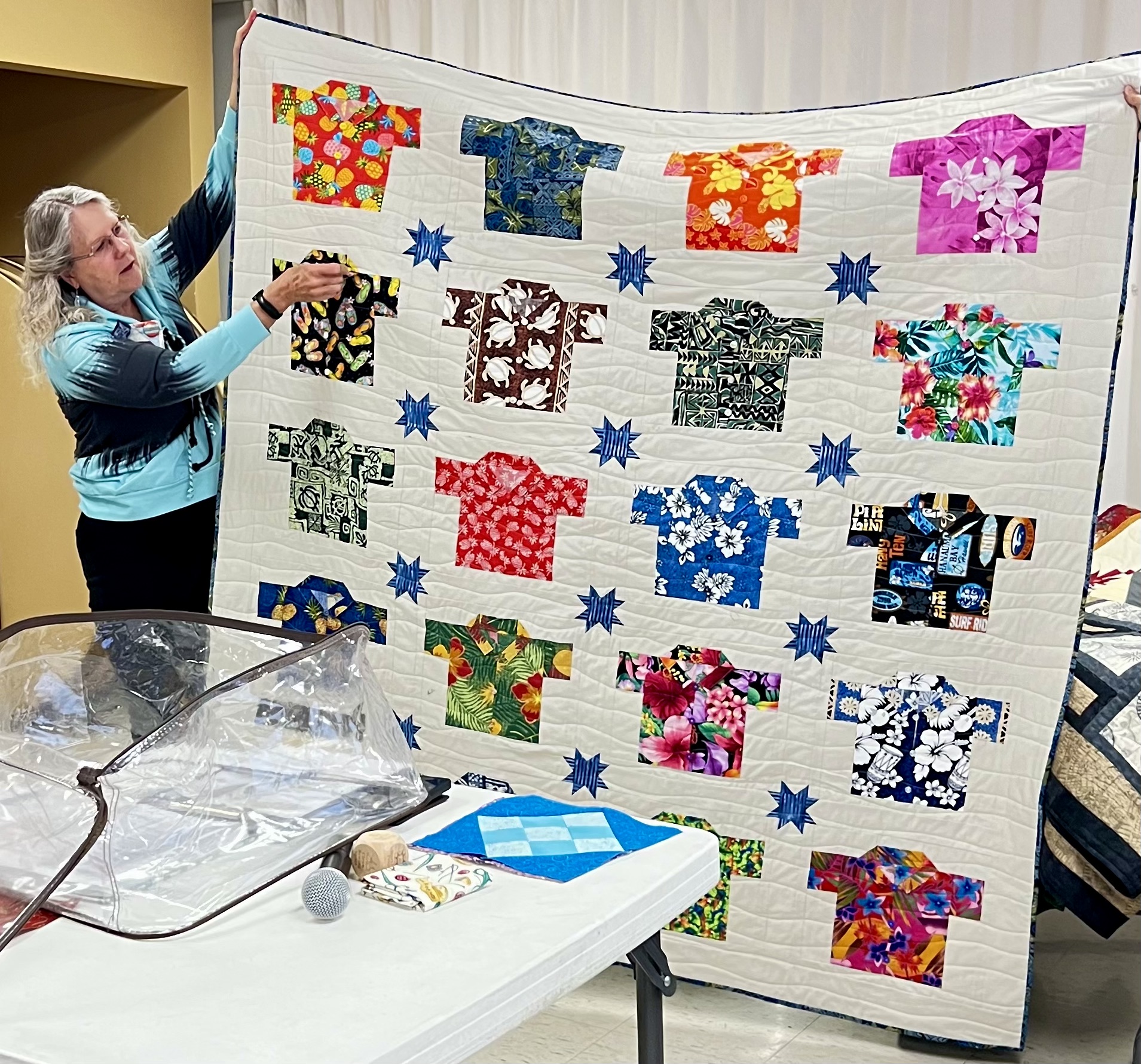 President Carla Hellwege displayed a Bow Tie block, one of the 2025 Challenge Quilt requirements