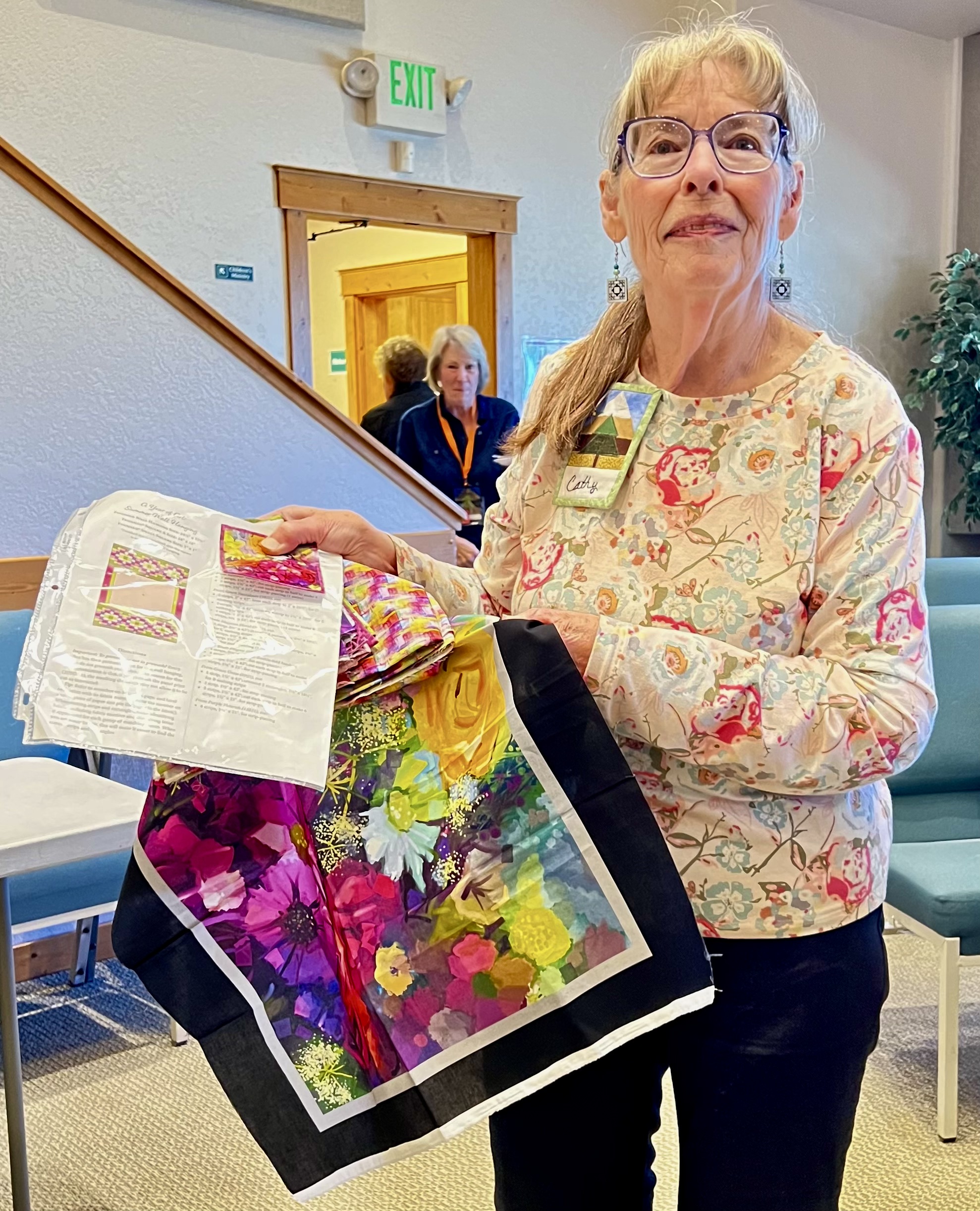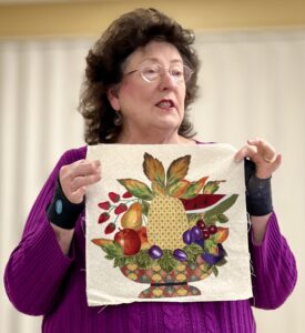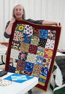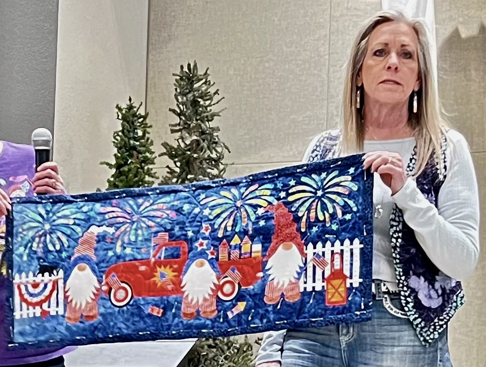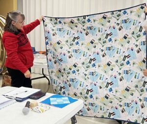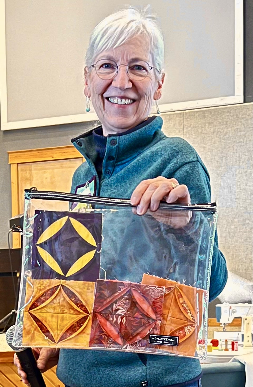 Susan Smith demonstrates next month’s pattern and Jeanie Brooks won this month’s blocks