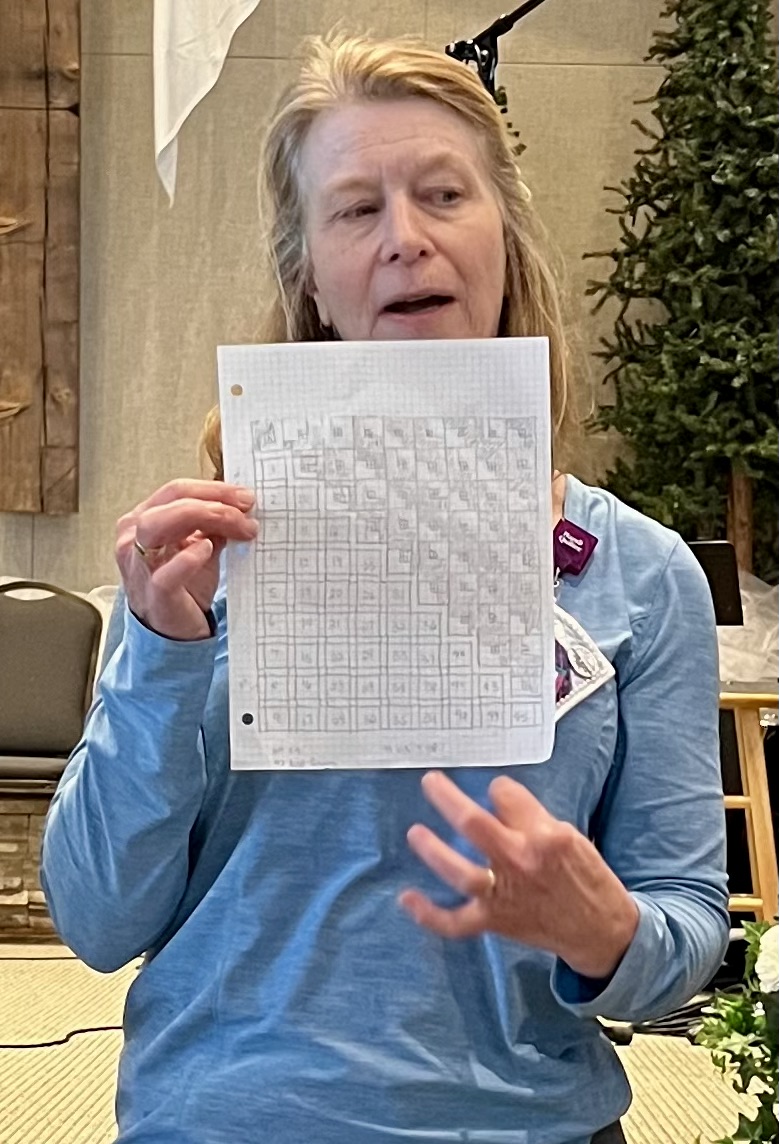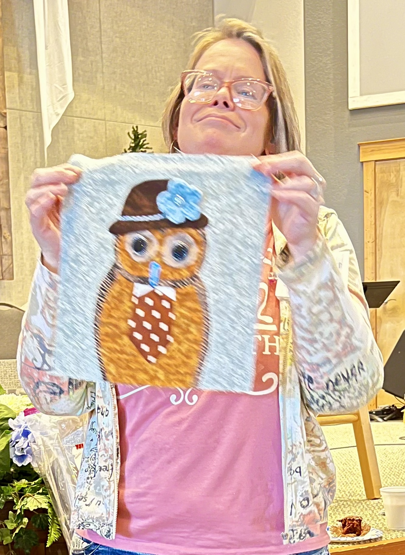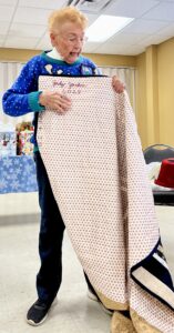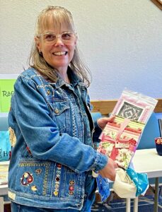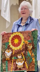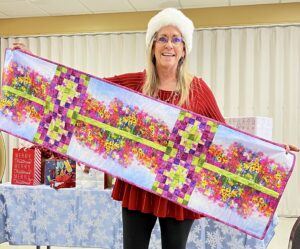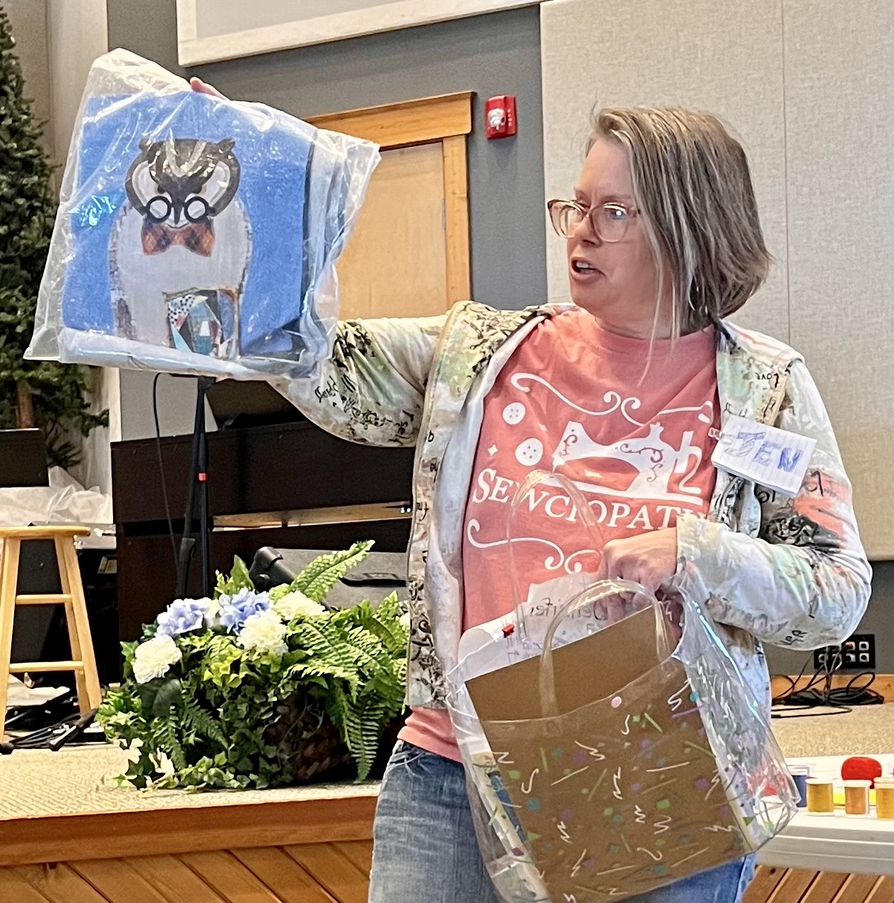 Susan Smith demonstrates next month’s pattern and Jeanie Brooks won this month’s blocks